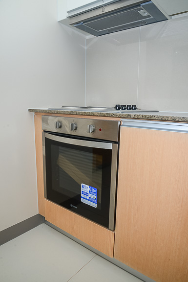 - Appliances include a double-door refrigerator, built-in oven, and a four-burner electric cook-top with hood
