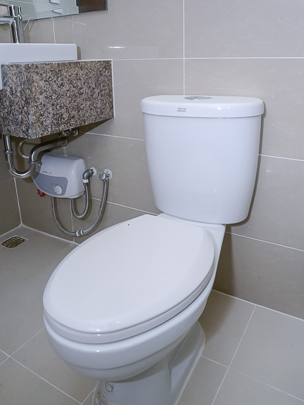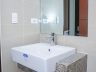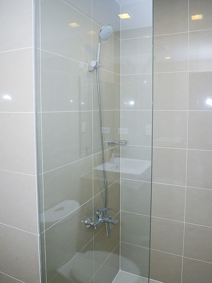 - The bathroom features a semi-recessed sink, a transparent shower enclosure, a hand-held shower-head, and a dual-flush toilet
