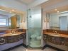 - Large master bathroom with the corner opaque shower enclosure between sangria-colored vanity counters each with an under-mount sink and wall-to wall mirrors and an alcove bathtub