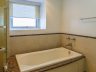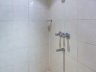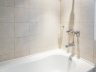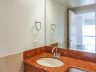 - Third bathroom with a fixed shower and an under-mount sink in a moss-green vanity counter