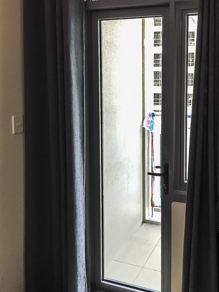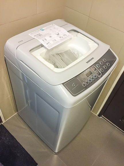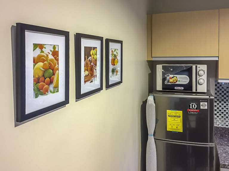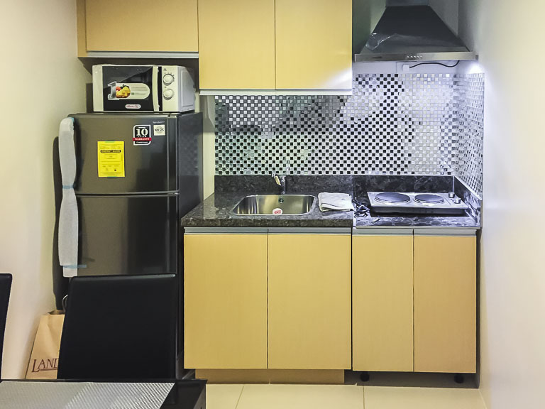- Kitchen fitted with two-door fridge, electric cooktop with range hood and microwave oven