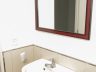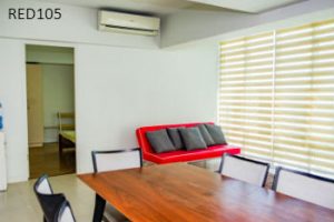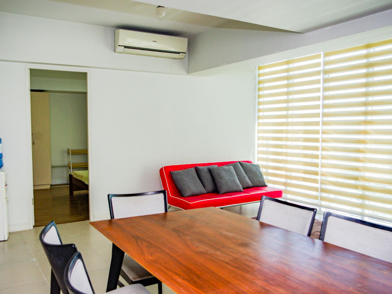 - The common area has a dining set for 6, a red sofa, wall-mounted large flat-screen TV and floor-to-ceiling windows