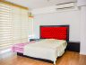 - Master bedroom has a king size bed with twin side tables, upholstered headboard, and walk-through closet leading to master bathroom
