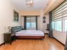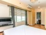 • The master’s bedroom features a wooden platform bed with an upholstered headboard between two nightstands with table lamps, dark floating shelf with the flat screen TV across the bed, and built-n cabinets near the door