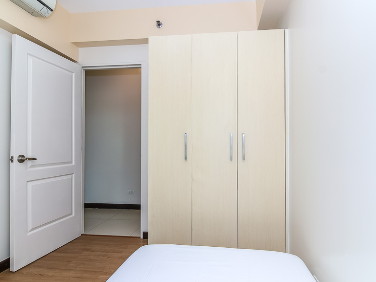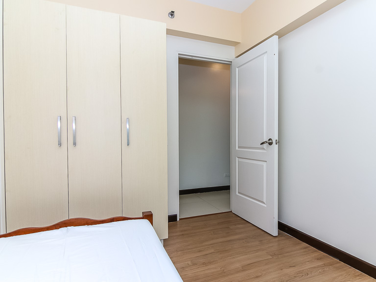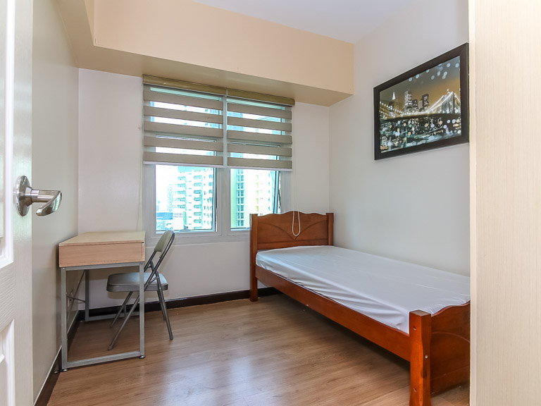• Bedrooms 2 and 3 are similar in layout, with single platform beds each, study table and chair, and built-in cabinets