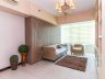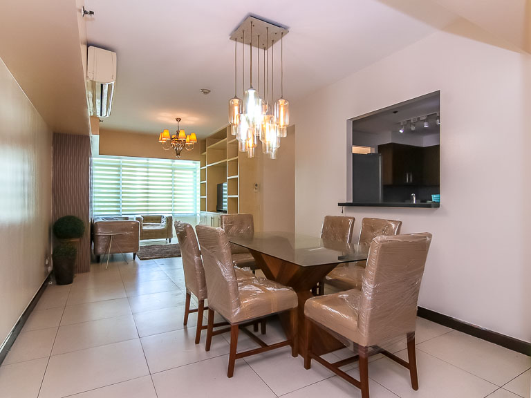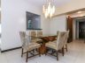 • The living and dining areas are in a continuous layout.  A cream leather tuxedo sofa set and side tables comprise the living room furniture, with the long sofa against a mauve-colored accent wall