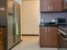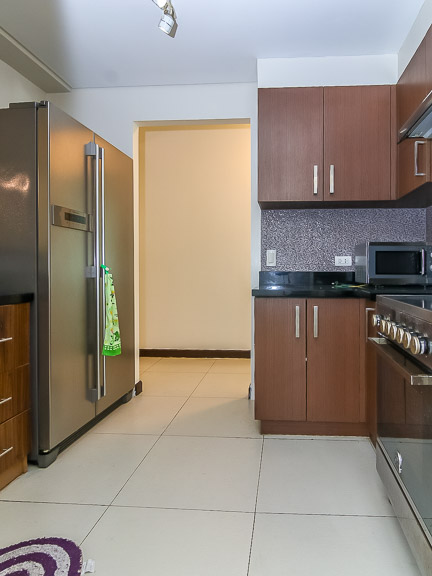 • The spacious kitchen is with black granite counter-tops and grey backsplash tiles.  Brown-colored cupboards, drawers, and cabinets provide multiple kitchen storage