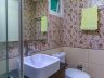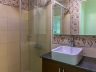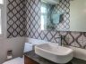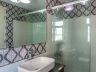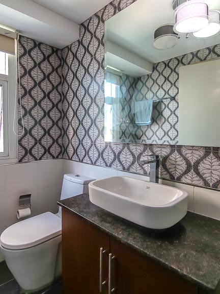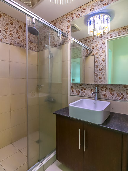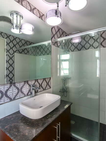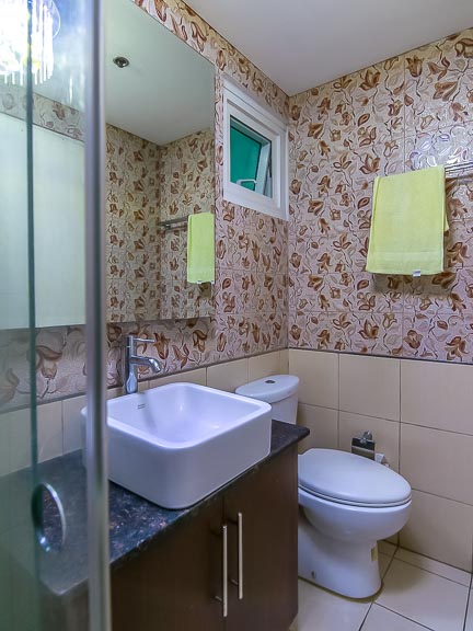 • Bathrooms 1 & 2 with patterned accent tiles and with windows for added ventilation have each a modern toilet, a vessel sink on a black counter-top, a transparent shower enclosure, and a fixed rainfall showerhead