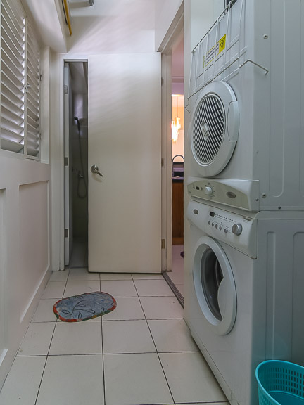 • Accessed through the kitchen is the laundry area with a stack-up washing machine and clothes dryer and a smaller bathroom