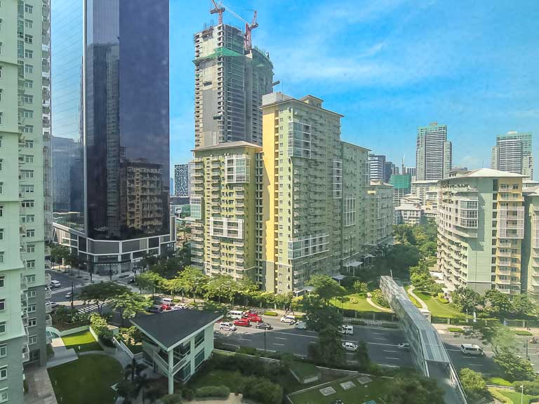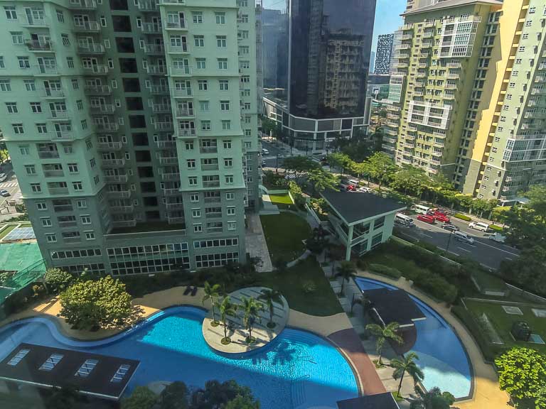 • A refreshing view of the landscaped gardens and garden pools can be glimpsed from the balcony, alongside the neighboring high-rise towers