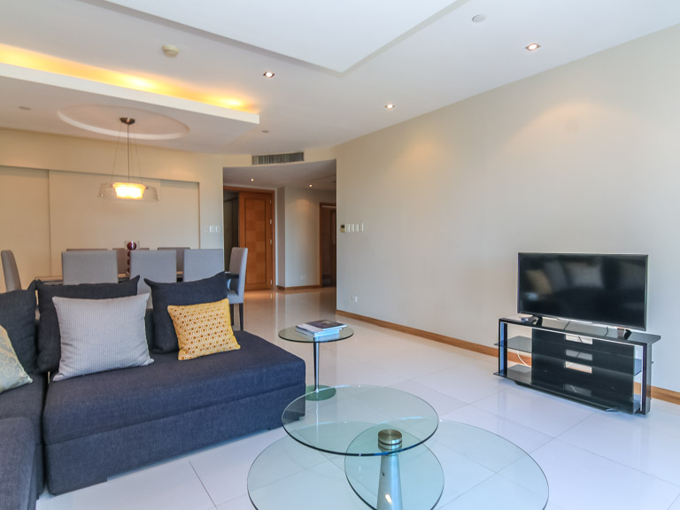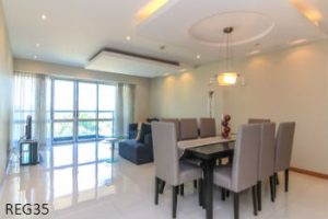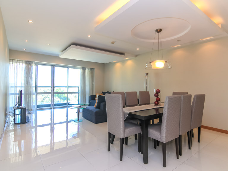 - The continuous layout of the living and dining room is further enhanced by the full glass wall and sliding doors leading to the balcony