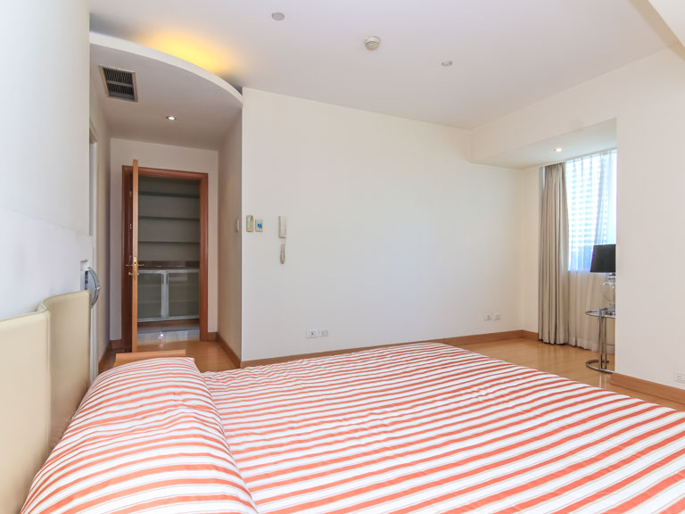 - The first bedroom is lavished with natural light from the big windows. A queen size bed with side tables and wall mounted night lamps are set near the big glass windows with double curtains of lace and beige fabric