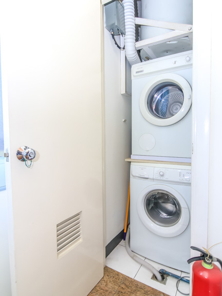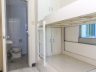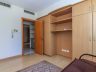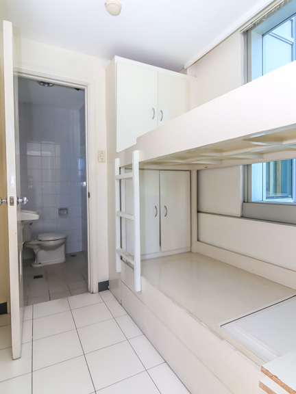 - Bedroom two has a sofa bed positioned near the windows. The length of the room is lined with built-in cabinets with open shelves and provision for a media unit under the shelves