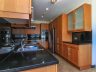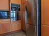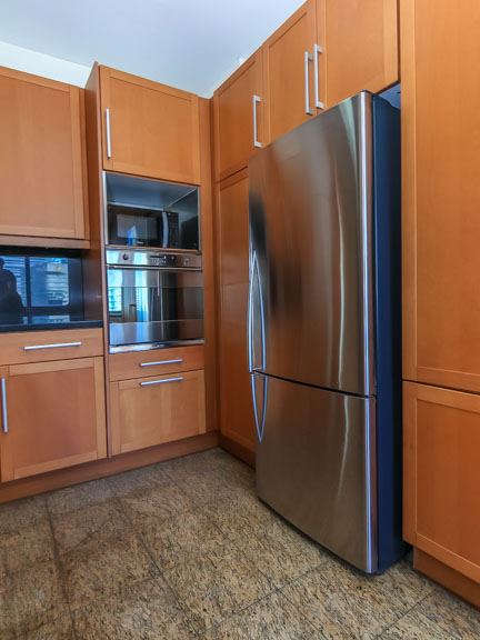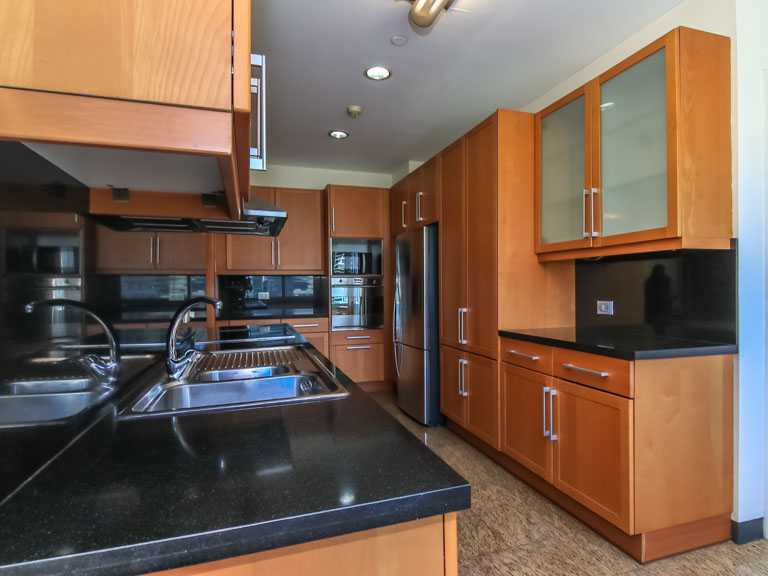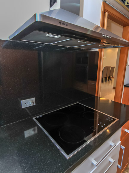 - Black granite counter-tops and back-splash tiles contrast the honey-colored cabinets. Appliances include the cabinet type inverted refrigerator, four-burner induction cook-top and range hood, a microwave and a built-in oven