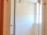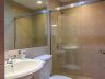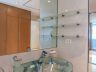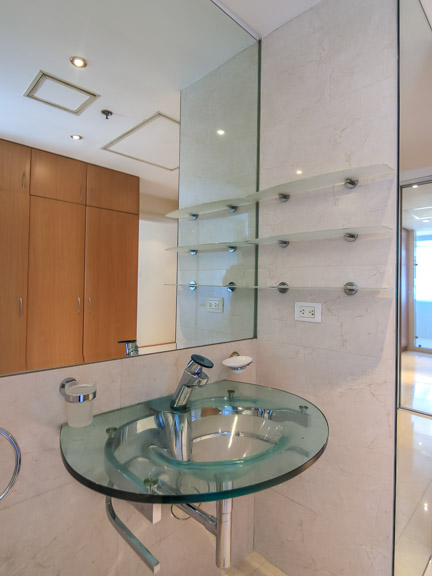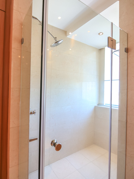 - The spacious blush tiled master bathroom has a shower enclosure and rainfall shower fitting and floating clear glass shelves. A full mirror enhances the bathroom and under it is a wall-mounted tempered glass bathroom sink