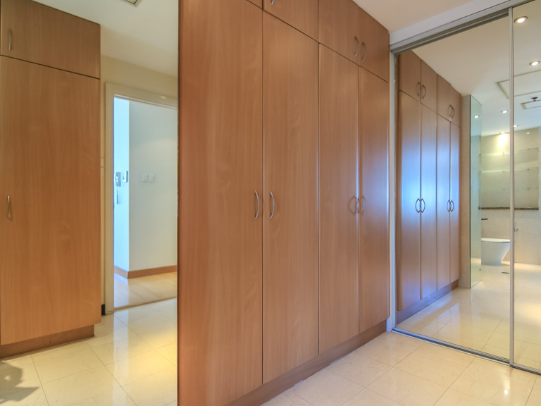 - This room has a walk-in closet with built-in cabinets and cabinets with mirror sliding doors. At a corner across the bed is a smaller window, a corner table with a table lamp