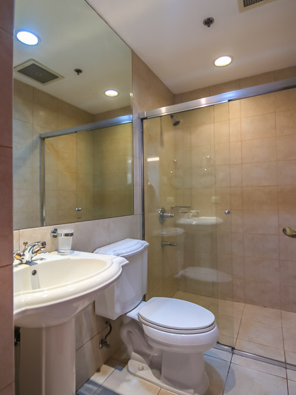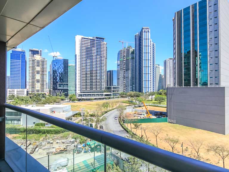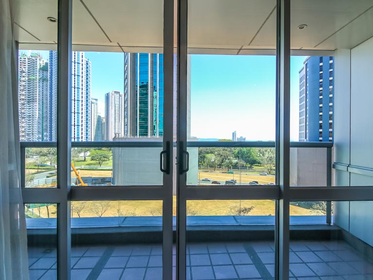 - A view from the balcony shows the city’s high structures and neighboring towers nearby, and at a distance is the Manila Golf Course