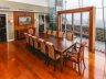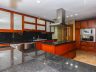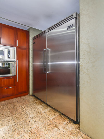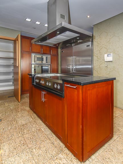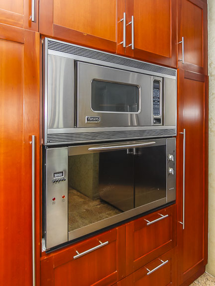 - Impressive kitchen with industrial-level equipment including 6-burner induction cook-top with hood, side-by-side refrigerator, wall-mounted conventional and microwave oven