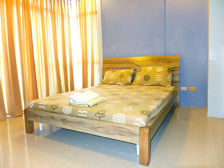 - Bedroom with a queen-sized mattress on wooden bed frame