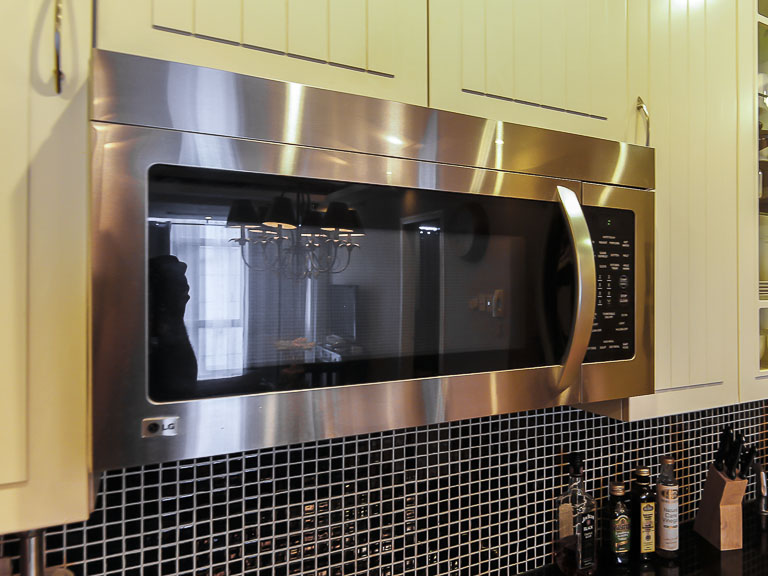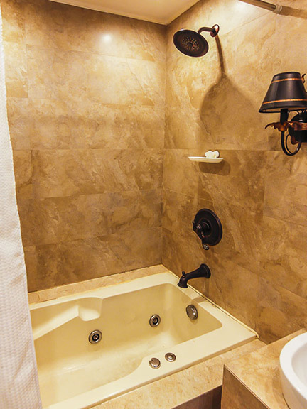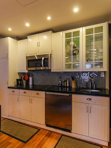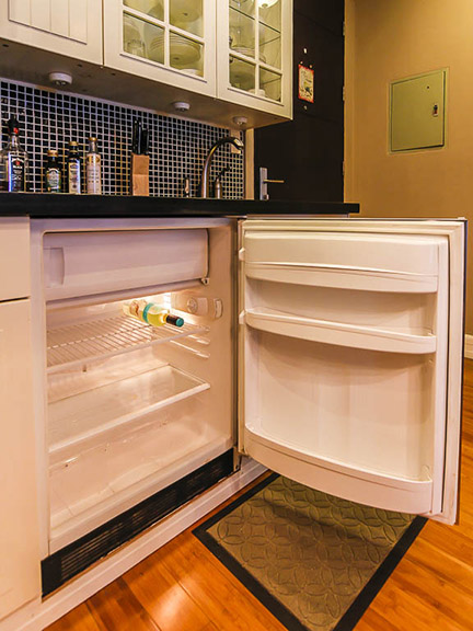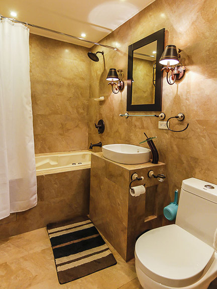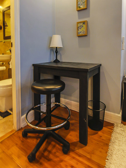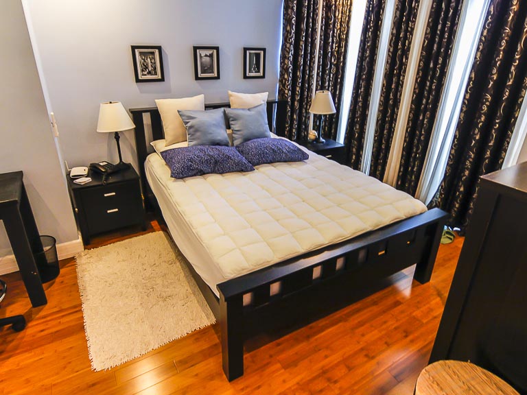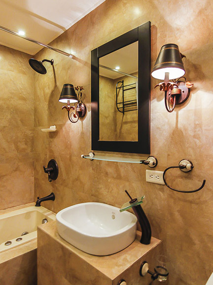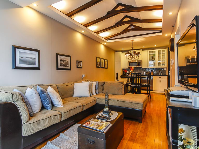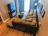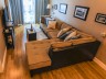 - Big sectional couch, flat-screen TV with entertainment system and an ornate wood trunk as a center table