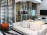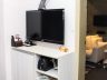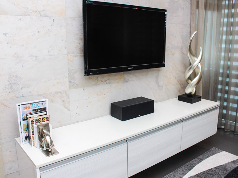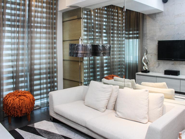 - In the living room, a full mirror wall creates an illusion of space. Leaning on this wall is an off-white fabric sofa. Across it is a media cabinet with the flat screen TV mounted on the wall above