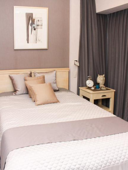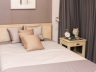 - The bedroom features an egg-nog toned wood framed bed with a headboard and matching bedside drawers. The headboard is against a mauve-colored accent wall