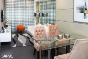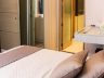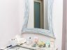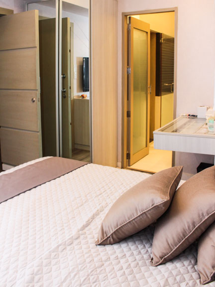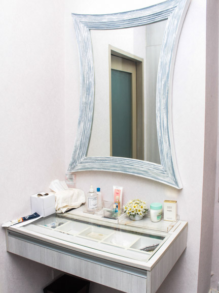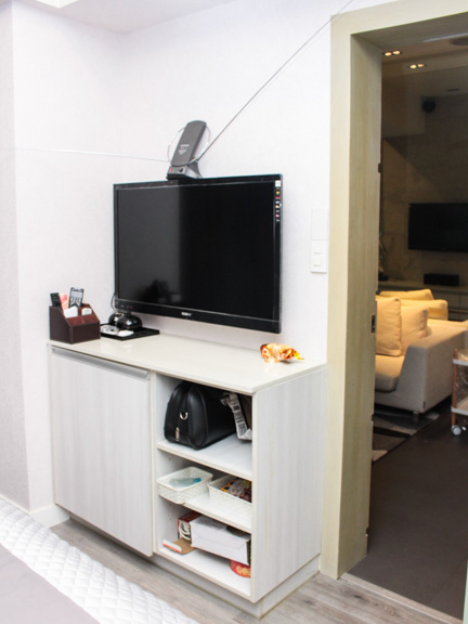 - Across the bed by the door is a low white table organizer and mounted on the wall above it is the flat screen TV. At a corner is a dresser table with a framed mirror mounted on the wall above it