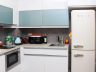 - The two-walled kitchen is with mosaic back splash tiles, white-painted base cabinets and cupboards with opaque doors. Appliances include a two-door refrigerator, a built-in microwave and an induction cook-top with a hood