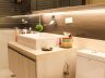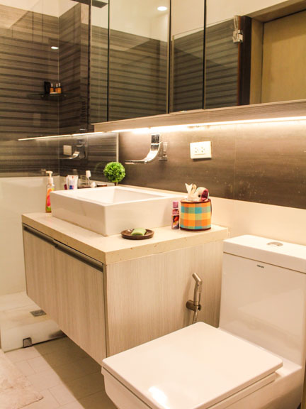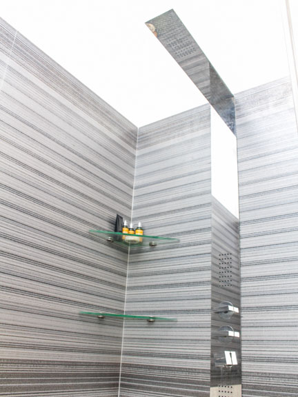 - The bathroom, in accent grey-toned tiles with corner floating glass shelves
