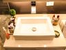 - A vessel sink sits on a cream-colored granite counter/cabinet next to the modern toilet