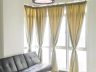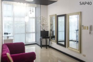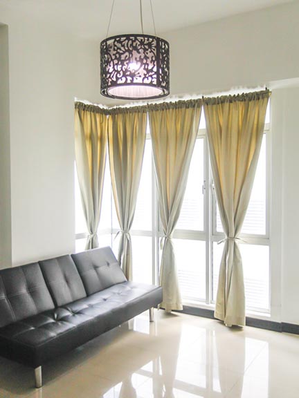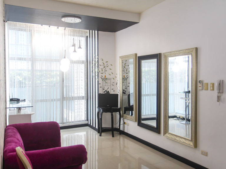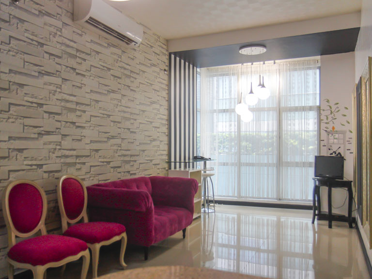 - Natural light comes from the glass panel wall of the living room. The room is furnished with magenta-colored chairs and a love seat