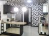 - The flat screen TV is on a dark wood corner table. Various wall-paper designs accent the living room walls