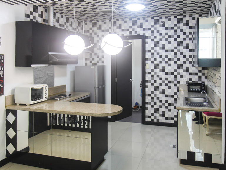 - The white-tiled kitchen is in a two-wall layout with a peninsula. Mosaic black and white tiles accent the kitchen wall and ceiling