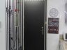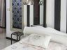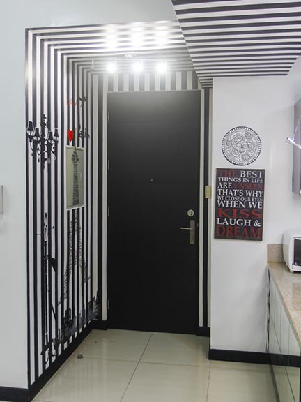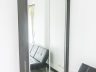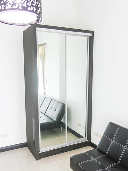 - The second bedroom is furnished with a black leather daybed/sofa and a black wardrobe cabinet with mirror sliding doors