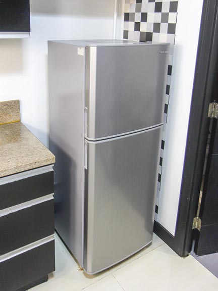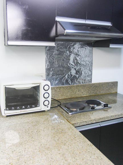 - The kitchen is furnished with a two-door refrigerator, a microwave and a two-burner electric cook-top with an under-cabinet range hood above it
