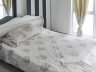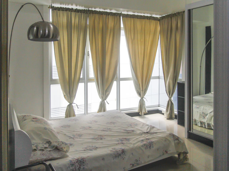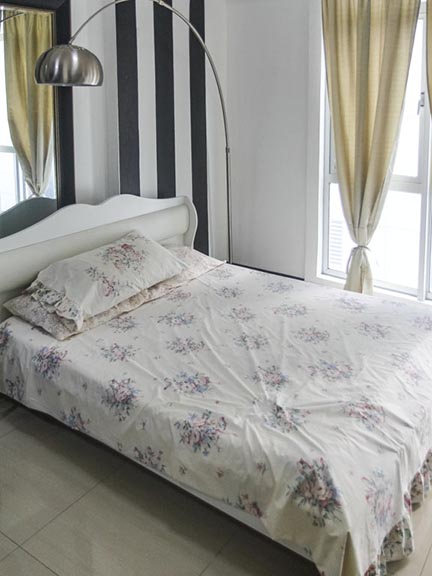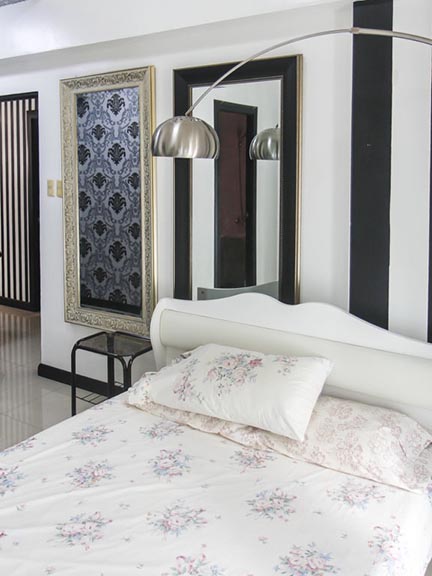 - The first bedroom is furnished with a white platform bed with a headboard and an arc lamp. Across the bed is a built-in cabinet with mirrored sliding doors