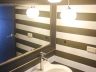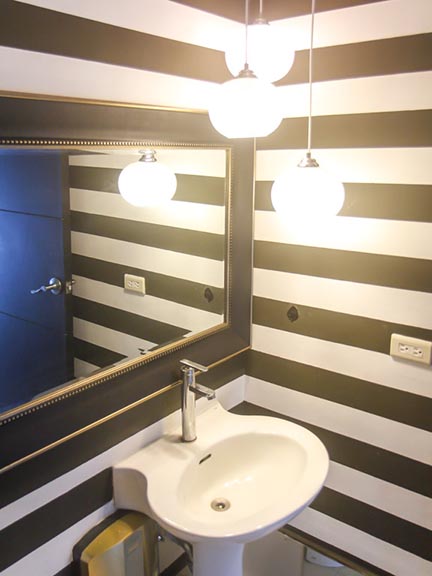 - The first bathroom with black and white accent walls has a floor-mounted pedestal sink. Mounted on the wall above the sink is a wide framed mirror