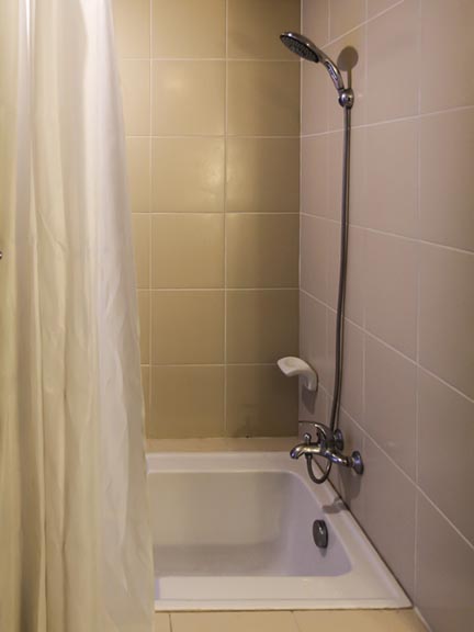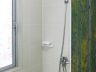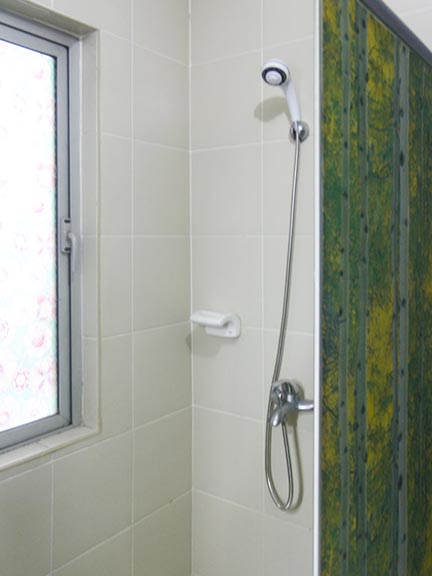 - Ventilation comes from the bathroom window. Bathroom fittings include a hand-held shower and a soap dish