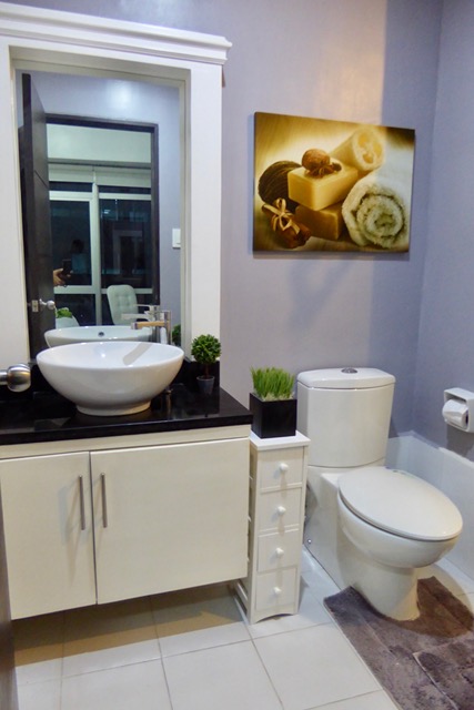 • The bathroom is equipped with classic items and a cabinet with an art-deco picture mounted on the wall