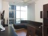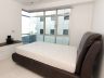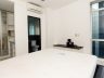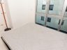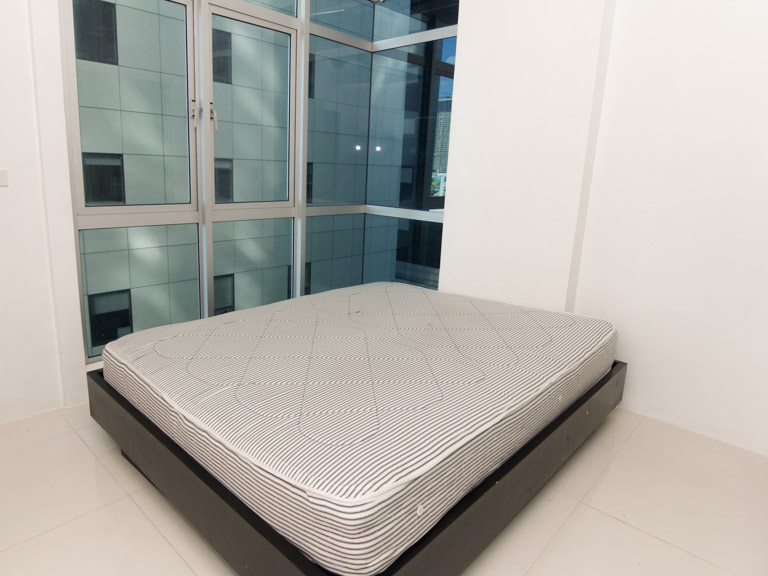 - Beside the bed a few steps away is a built-in cabinet with opaque doors, and drawers