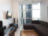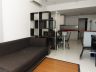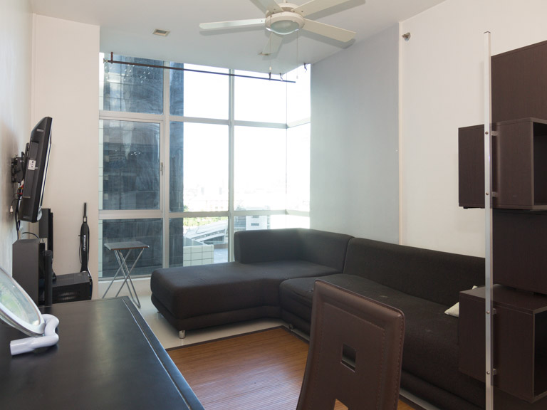 - The living room is furnished with a dark fabric-covered sectional sofa