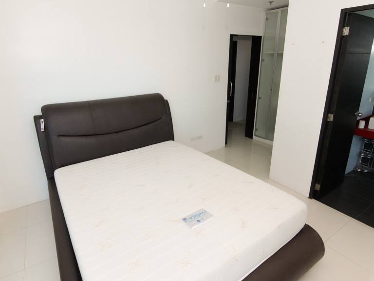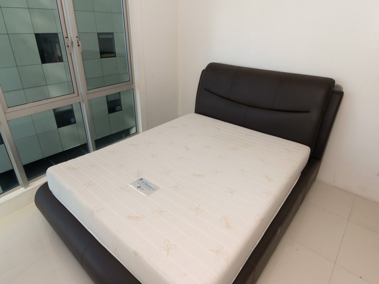 - The other room is furnished with a queen-sized dark-wood framed platform bed