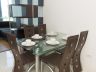 - The dining set is a glass table with metal framed wooden dining chairs in a modern design