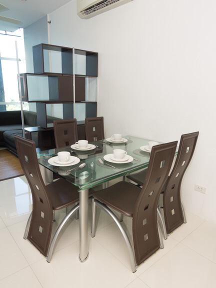 - A split-type air-conditioner is mounted on the wall high above the dining set