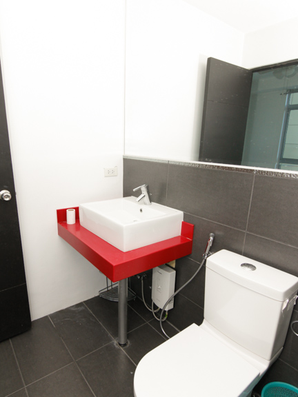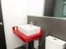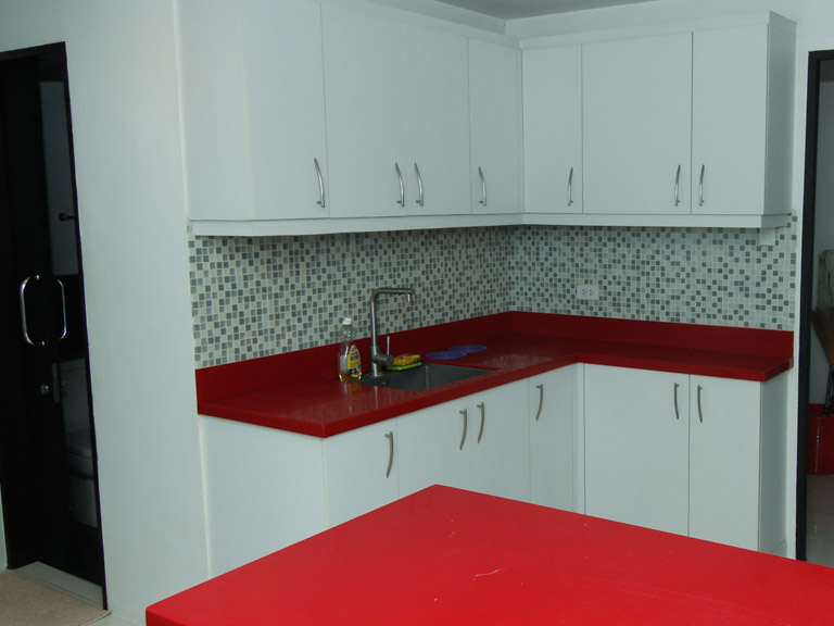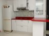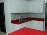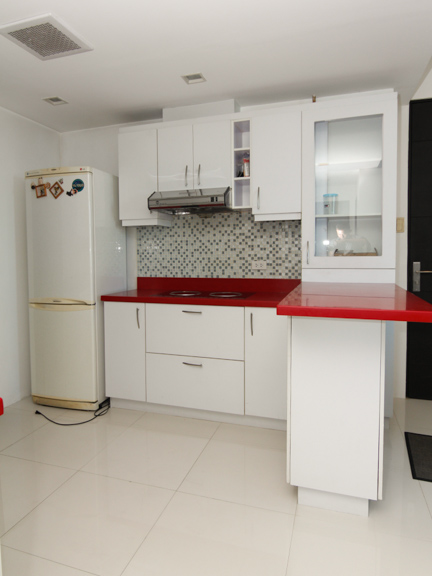 - Beside the ref is the red counter mounted with a double burner cooktop
