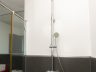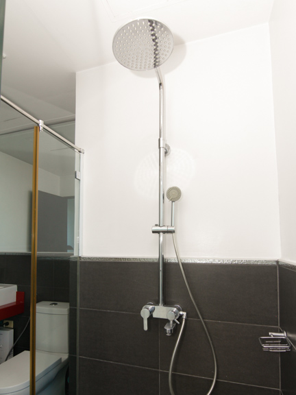 - A fixed raindrop shower is mounted on the wall. A hand-held shower is also fitted