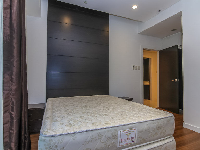 - Bedroom one features a queen sized bed against a full dark accent headboard wall, and two bedside drawers. Across the bed are a white study table and chair and a low two-layered open rack organizer