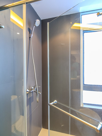 - The smoke-grey walled bathroom with a wide glass window is fitted with a rain shower and has a clear glass enclosure. A white vessel sink sits on top of a white marble counter cabinet. Above it is a full mirror