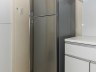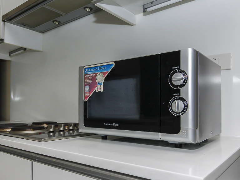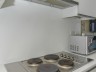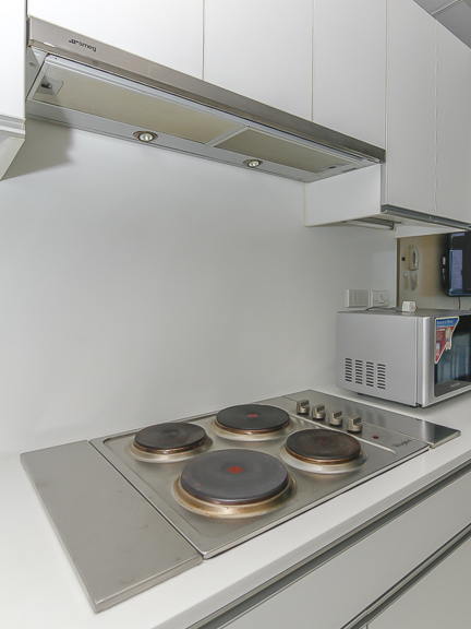 - Two-door fridge, electric cooktop with hood and microwave oven in open kitchen