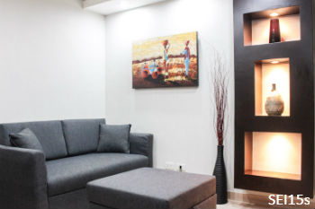 - A three-shelved decorative wall rack with recessed lights adds drama to the living room